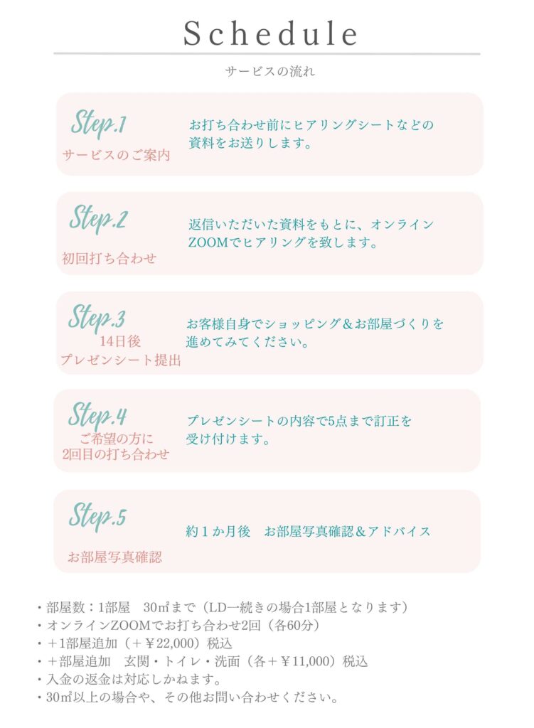3. あなた専用「お買い物セレクトシート」作成 あなたの予算内で、空間の質をぐっと引き上げるアイテムを厳選。パースであなたのお部屋を再現しながら、家具~小物の具体的な配置や見え方がわかるシート(具体的な購入先URL付き)でお届けするので、迷わずあなたのペースで整えられます。